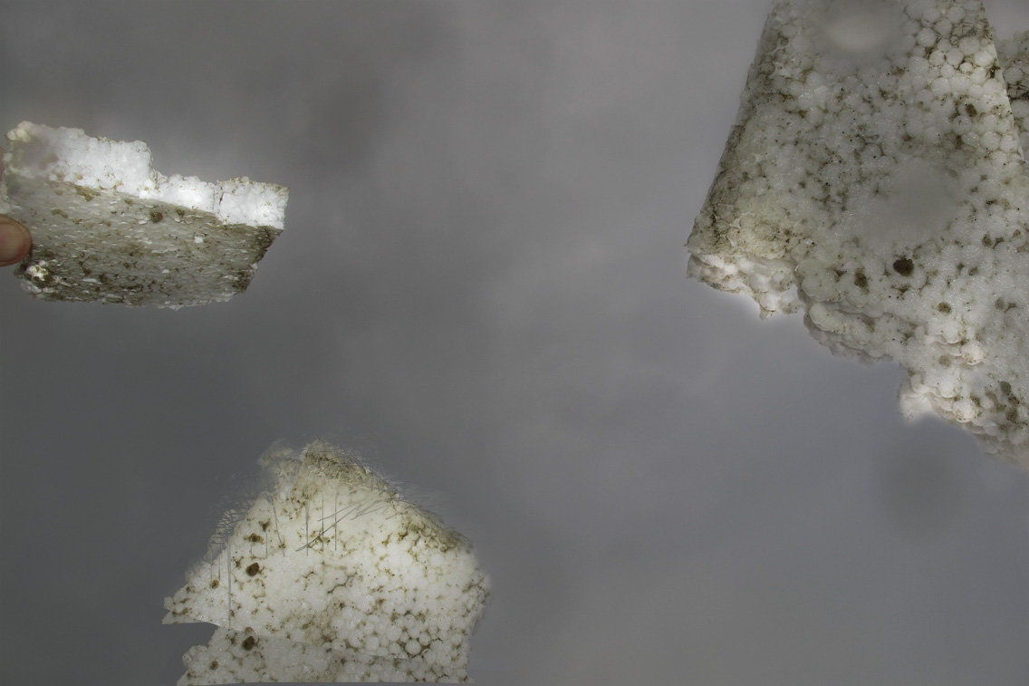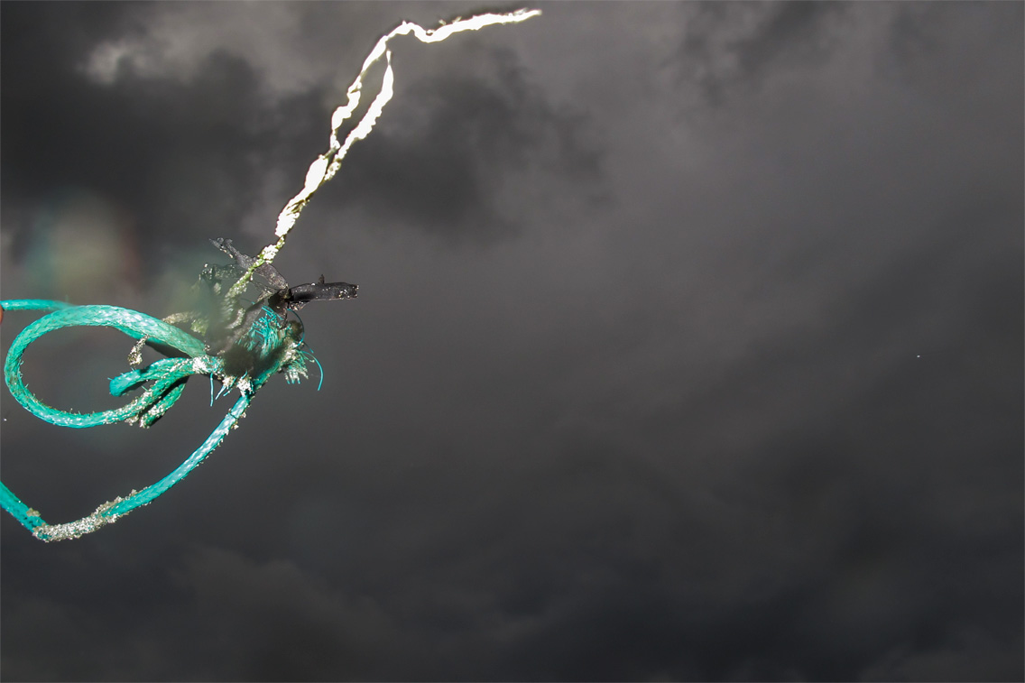 out there now plastic trash pieces found on the shore of the northsea, sky formed a beautiful darkgrey melancholic background, cold and thunderstorm approaching. light against the dark.